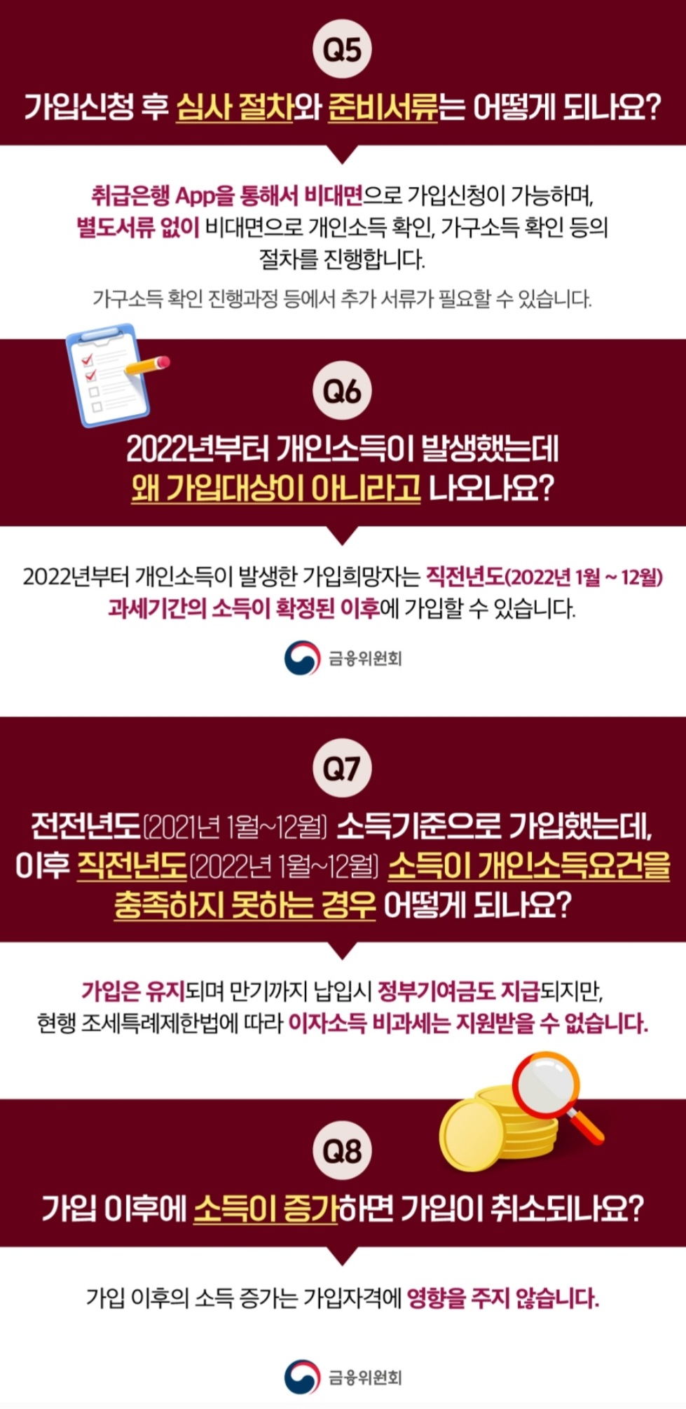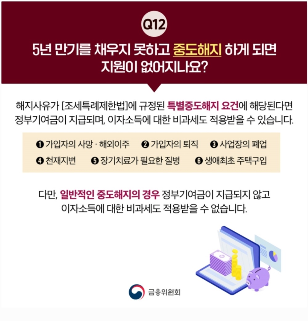 - 가입일 현재 직전 과세기간의 소득이 확정되지 않아 전전 과세기간의 소득을 기준으로 가입한 경우 가입 후 직전 과세기간의 소득을 기준으로 한 개인소득 기준을 충족하지 못하는 것으로 확인되면 비과세 혜택 적용 불가하며, 금융소득종합과세 대상자 여부로 확인되면 납입중지 처리