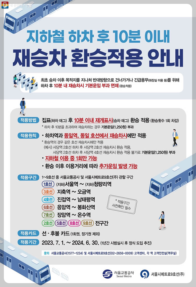 - 7월 1일을 기점으로 동일 역에서 재승차 시 환승 적용이 됨에 따라 추가 요금이 부과되지 않습니다.