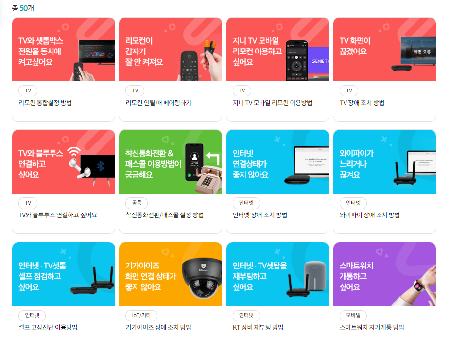 KT홈페이지에서는 50여가지 문제해결법을 동영상으로 제공합니다.