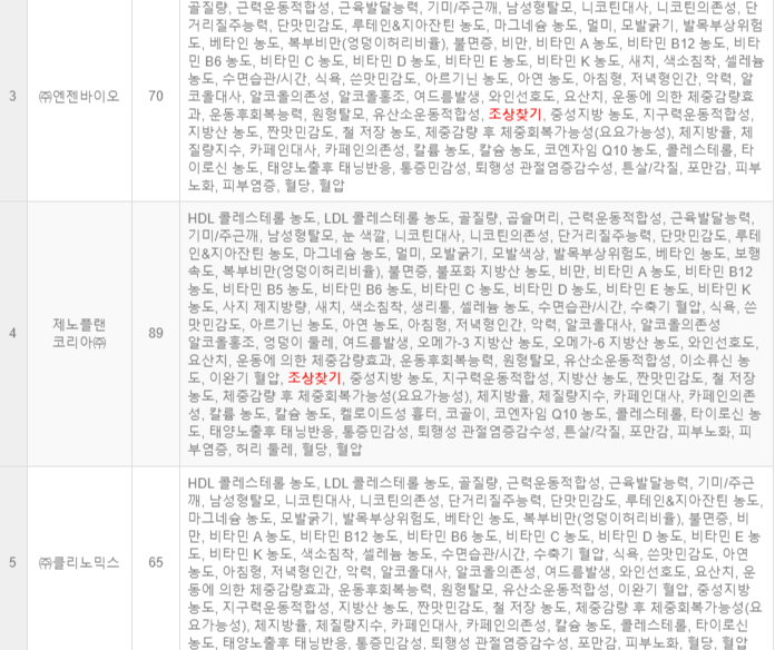 | 5 | ㈜클리노믹스 | 65 | HDL 콜레스테롤 농도, LDL 콜레스테롤 농도, 골질량, 근력운동적합성, 근육발달능력, 기미/주근깨, 남성형탈모, 니코틴대사, 니코틴의존성, 단거리질주능력, 단맛민감도, 루테인&지아잔틴 농도, 마그네슘 농도, 모발굵기, 발목부상위험도, 베타인 농도, 복부비만(엉덩이허리비율), 불면증, 비만, 비타민 A 농도, 비타민 B12 농도, 비타민 B6 농도, 비타민 C 농도, 비타민 D 농도, 비타민 E 농도, 비타민 K 농도, 색소침착, 셀레늄 농도, 수면습관/시간, 수축기 혈압, 식욕, 쓴맛민감도, 아연 농도, 아침형, 저녁형인간, 악력, 알코올대사, 알코올의존성, 여드름발생, 와인선호도, 요산치, 운동에 의한 체중감량효과, 운동후회복능력, 원형탈모, 유산소운동적합성, 이완기 혈압, 중성지방 농도, 지구력운동적합성, 지방산 농도, 짠맛민감도, 철 저장 농도, 체중감량 후 체중회복가능성(요요가능성), 체지방율, 체질량지수, 카페인대사, 카페인의존성, 칼슘 농도, 콜레스테롤, 타이로신 농도, 태양노출후 태닝반응, 통증민감성, 퇴행성 관절염증감수성, 포만감, 피부노화, 혈당, 혈압 |