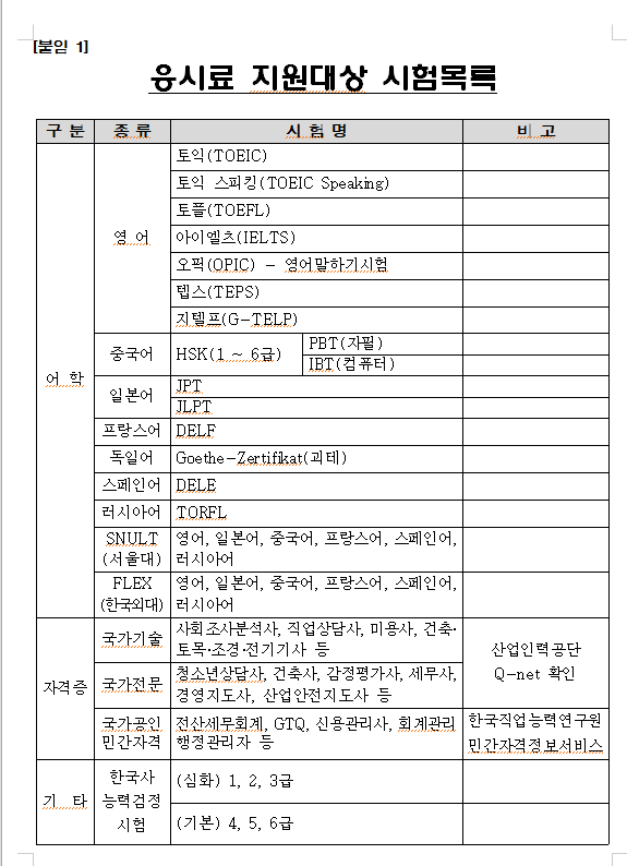 응시료 지원대상 시험 목록